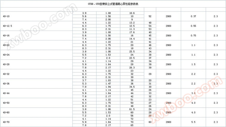 3、 Performance parameter table of pipeline centrifugal pump: