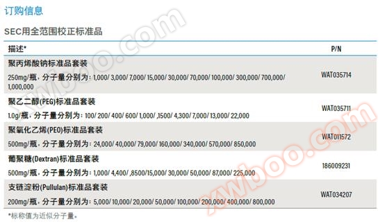 These standards provide a calibration range for determining the molecular weight of common water-soluble polymers. These sets include a series of specific water-soluble polymer standards that have been characterized and analyzed, as well as certificates of corresponding component molecular weight ranges and concentrations.